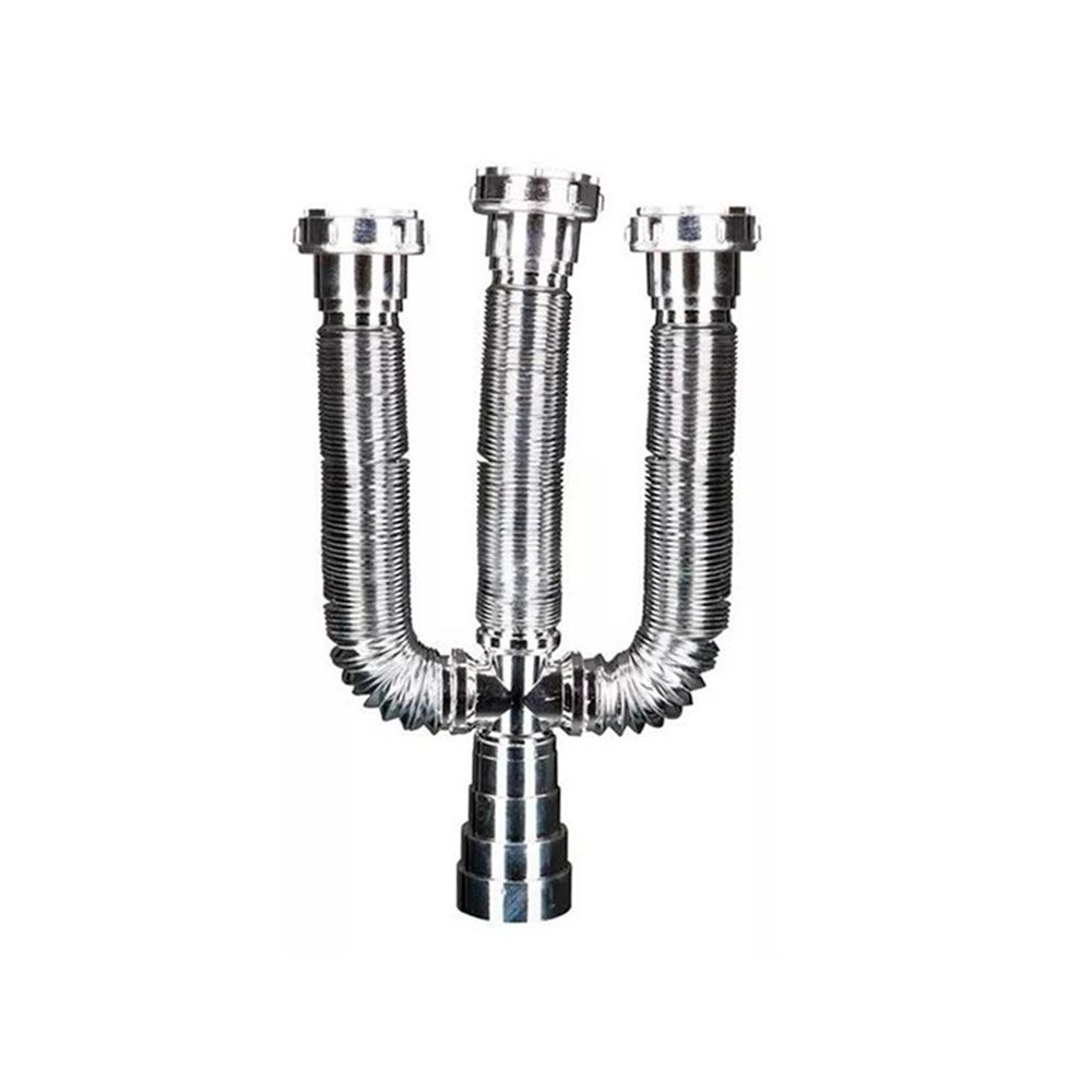 Sifão triplo sanfonado, próprio para cubas triplas, ligando três ralos (três cubas) a um único esgoto.